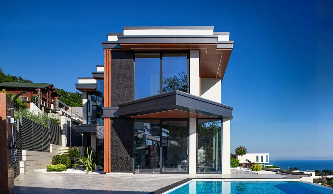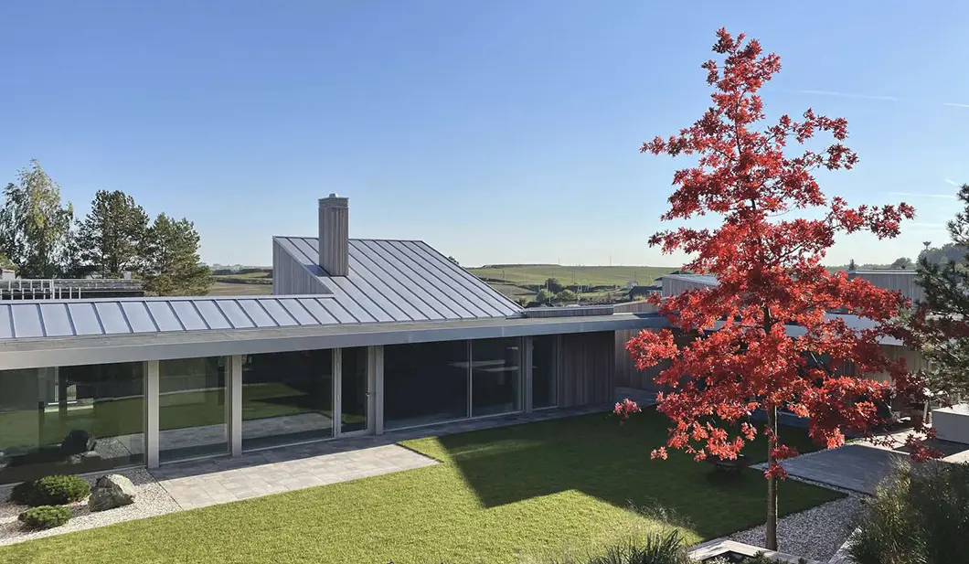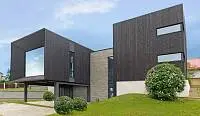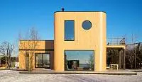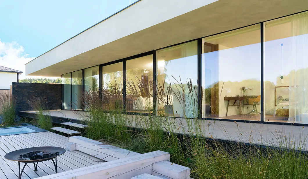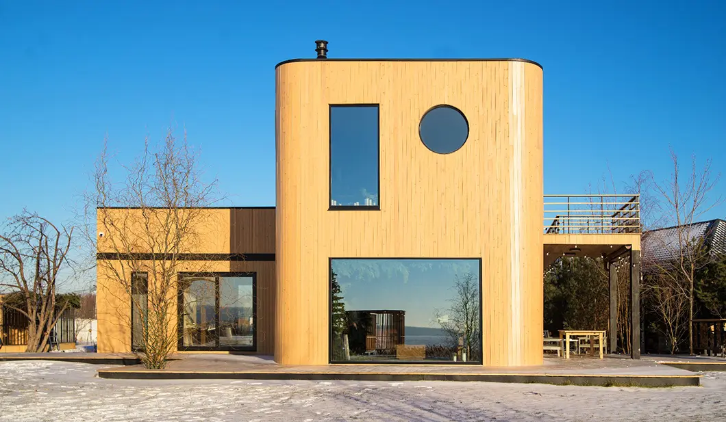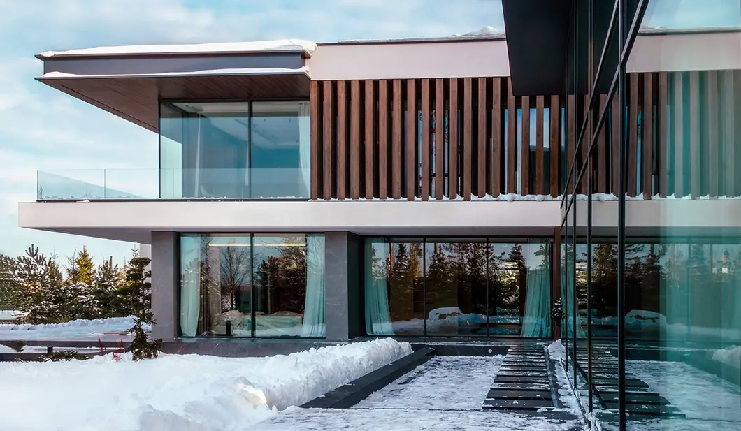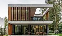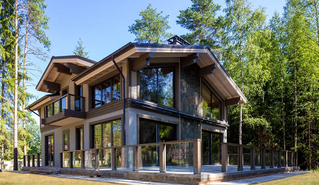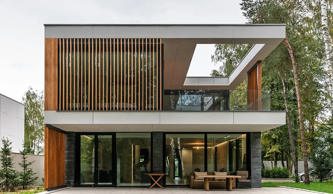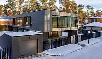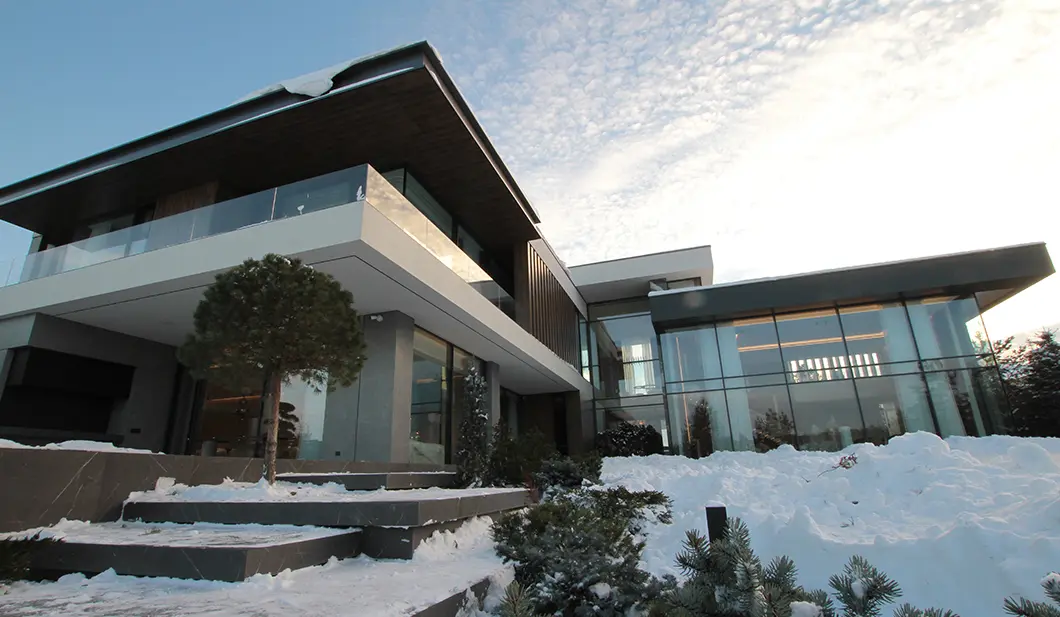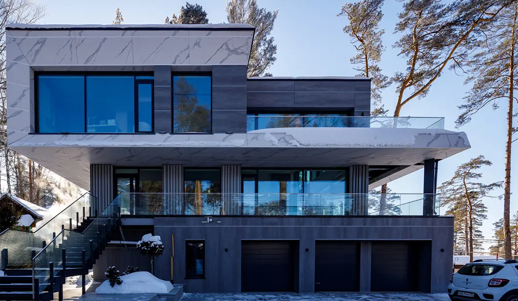 Почти незаметные в экстерьере роллеты со скрытым коробом позволяют управлять световым потоком: ночью затемняют комнаты, утром впускают в них бодрящий свет солнца. Защищают дом от шума, а остекление — от механических повреждений и осадков.