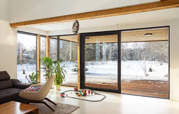 Почти незаметные в экстерьере роллеты со скрытым коробом позволяют управлять световым потоком: ночью затемняют комнаты, утром впускают в них бодрящий свет солнца. Защищают дом от шума, а остекление — от механических повреждений и осадков.