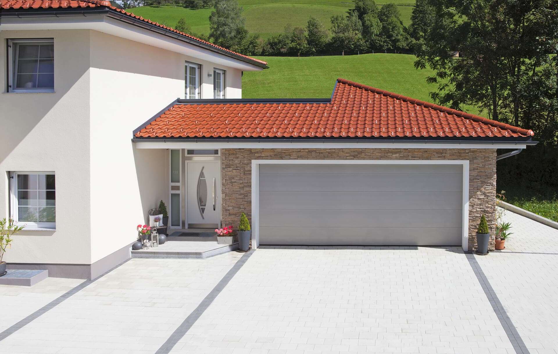 На выбор предоставляется 5 типов сэндвич-панелей, до 15 стандартных цветов (окраска в которые входит в стоимость), более 200 цветов по каталогу RAL или DB и оттенки под дерево (за доплату). Вы также можете заказать нанесение любого изображения на полотно ворот серии Prestige